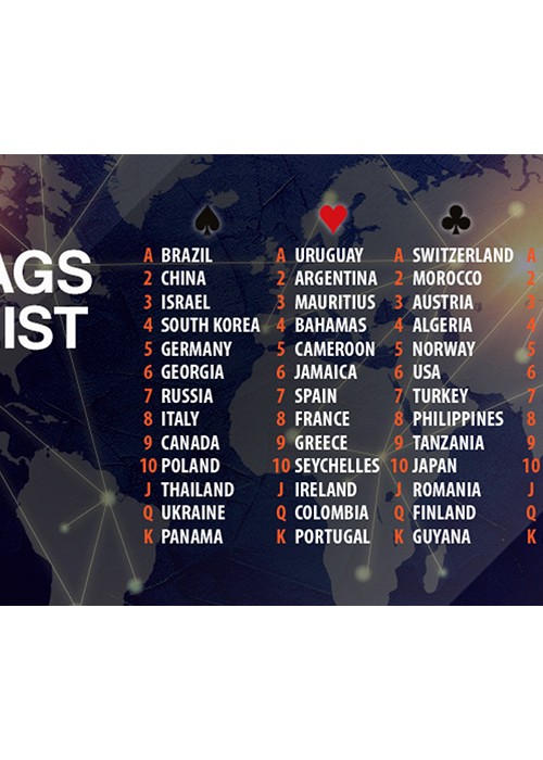 This deck is crafted for magic by French magician Yoan Tanuji for Magic Dream, magic store in France. The card backs have a total of 52 flags from 52 different countries with the overlay design of Maiden Back. There are two extra aces for a four-aces magic routine, a double backer of USA flag, and a card bearing the list of countries of the flag used in the deck – link to the instruction video of magic tutorial using the deck.