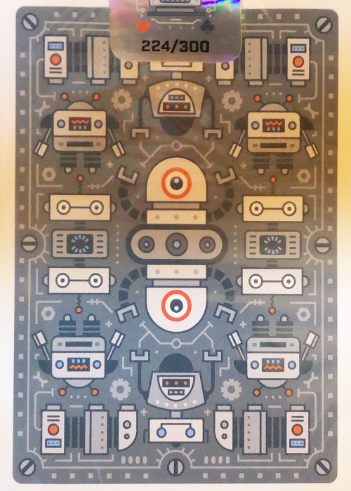 This is an ultra-limited silver gilded edition of the Bicycle Robot playing cards. Only 300 decks are available. Beautiful silver foil edges give a touch of elegance and shine to the deck. Each deck has an individually-numbered sticker seal to protect your treasure.