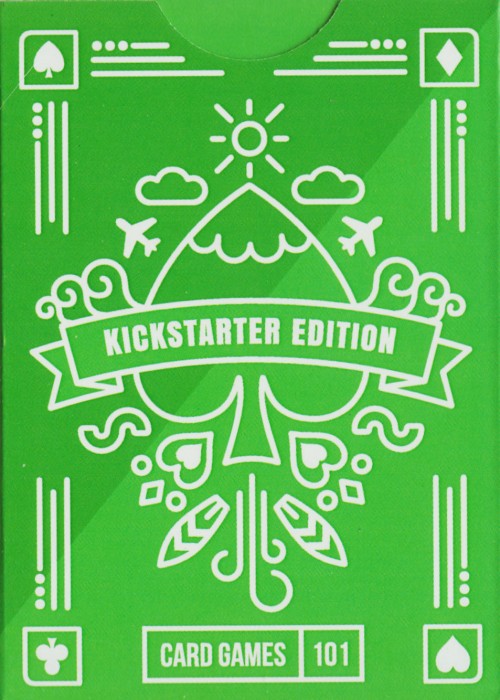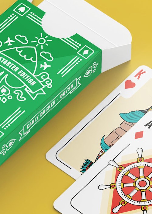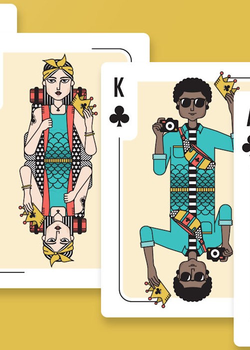 The deck is a standard deck of cards from Ace to King with four suits. We have designed the front and backs of the cards around a travel theme.