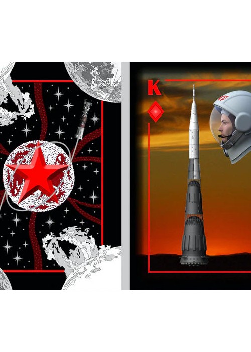 The Spades are rockets launched by United States, the Diamonds are rockets from the Soviet Union / Russia, the Hearts are rockets from other space-faring countries, and the Clubs are craft that have carried life into space. The spacecraft are meticulously modeled and placed over a red nebula (Diamonds and Hearts), or blue nebula or the Earth (Spades and Clubs).