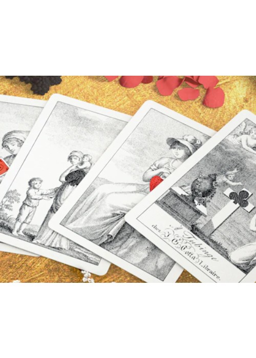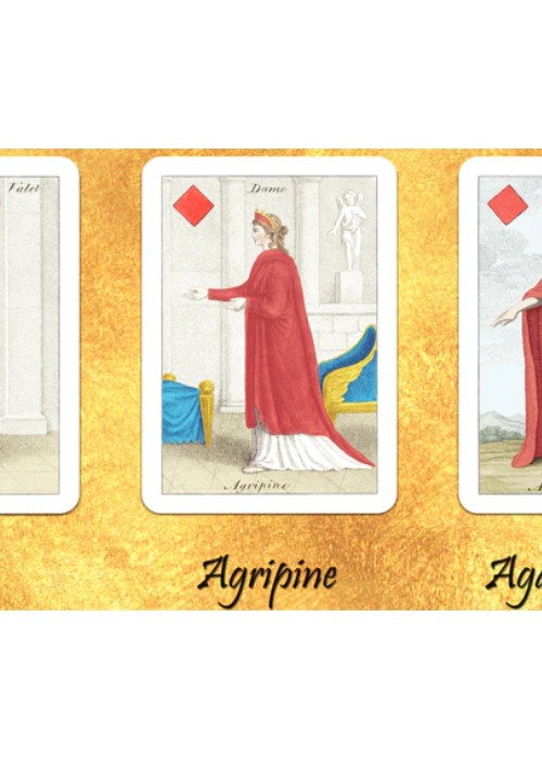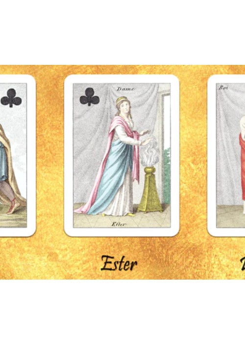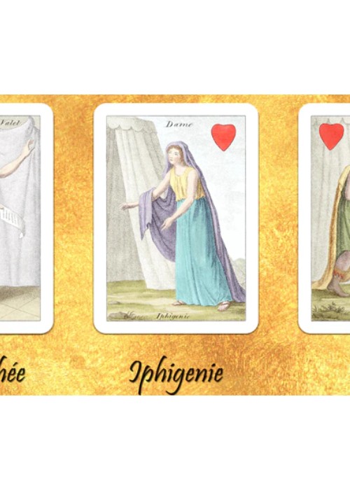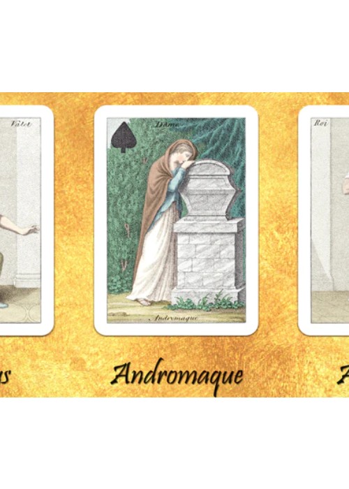 The green Andromaque deck is the second in a series of six famous decks we plan to release. The second transformation deck issued by Cotta is from 1806, following the remarkable success of the first almanac deck. This deck was also aimed to have well-known court cards, the interesting main character, and featured figures from classical antiquity, taken from sources such as Greek and Roman plays, as well as the Bible, which adds another historical value to its rarity.