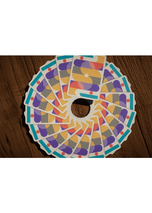 The backs feature rich CMYK colors. The design is made in such a way that all fans, spreads, and cuts complement the different elements. The lines look amazing in spreads and fans, while the circles move along with the cards in twirls, spins, and cuts. The block-like elements make for fantastic packet cuts as well.