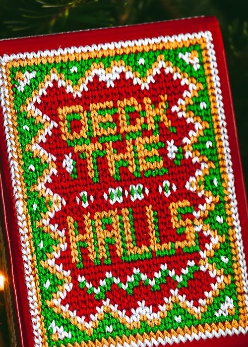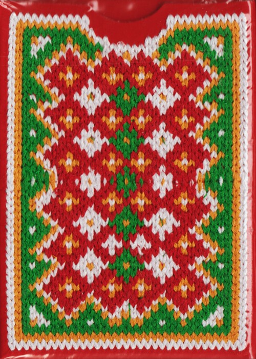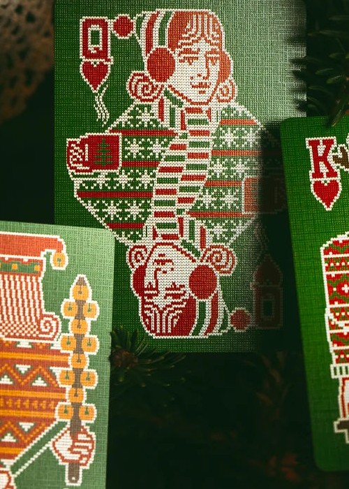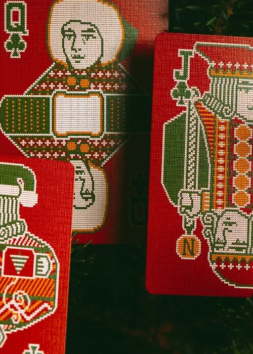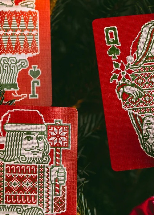 Deck The Halls originally released in 2018 taking inspiration from those horrifically ugly sweaters your dad wore to Christmas parties and bragged about. The knitted texture design around the tuck case is 100% real and literally woven into the tuck case. With a new color scheme that includes gold thread in the exterior fabric design and gold foil on the card backs, the new Deck The Halls is of the utmost ugly sweater deliciousness, inside and out.