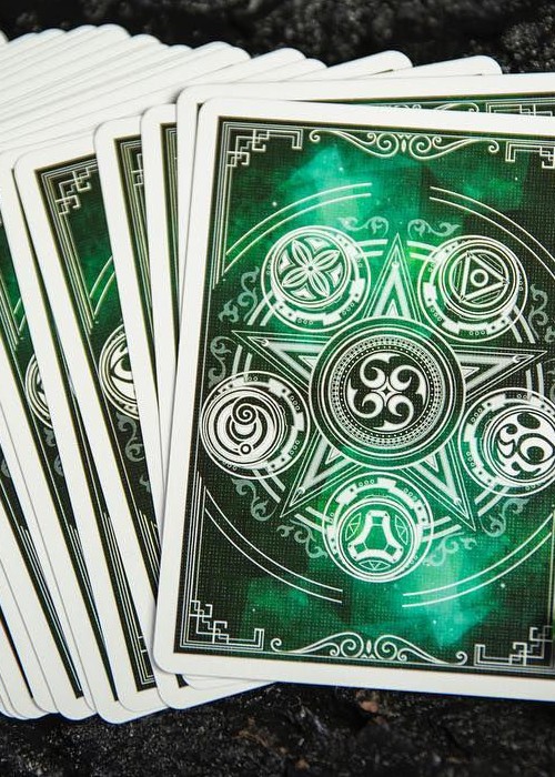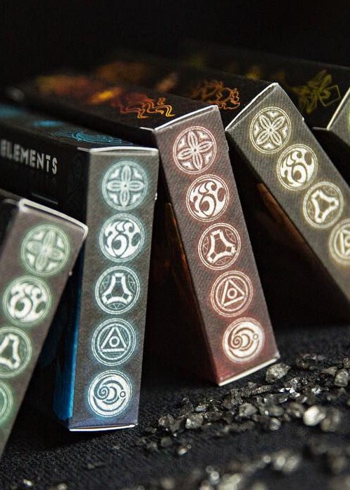 The full set consists of 5 decks of cards. 5 distinct designs correspond to 5 elements, which are represented as a totem on the back of the card and the card box.