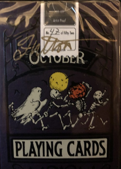 This is the Artist Proof Edition of Fulton’s October Version 3. This deck’s tuck has a hand numbered black and white Artist Proof seal with Brad Fulton’s signature in gold on the back. Only 52 of this edition were offered. First released back in 2013 and then again in 2014. Fulton’s October playing cards return in an all-new way. Designed by Brad Fulton with original illustrations by Steven Noble. The cards feature a classic Halloween theme printed in the negative. The custom back design, ace of spaces, and face cards come packaged inside a gorgeous foil-stamped and embossed tuck box. Sustainably-produced using FSC certified paper and vegetable-based inks on our trademark thin-stock and finish. Printed by the United States Playing Card Co