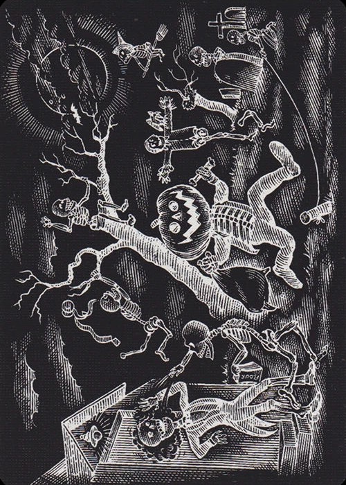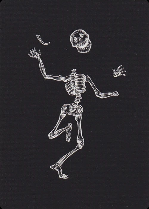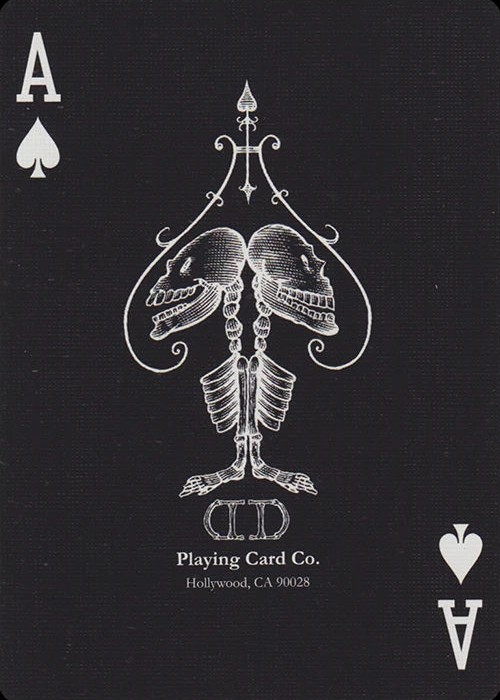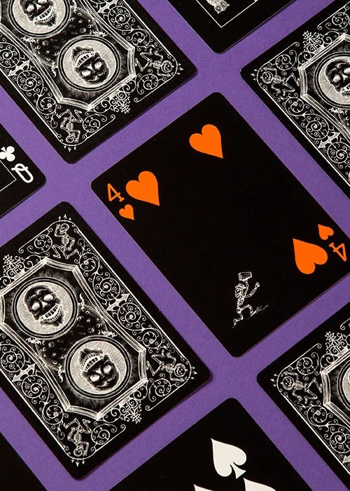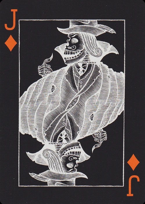 The cards feature a classic Halloween theme printed in the negative. The custom back design, ace of spaces, and face cards come packaged inside a gorgeous foil-stamped and embossed tuck box.