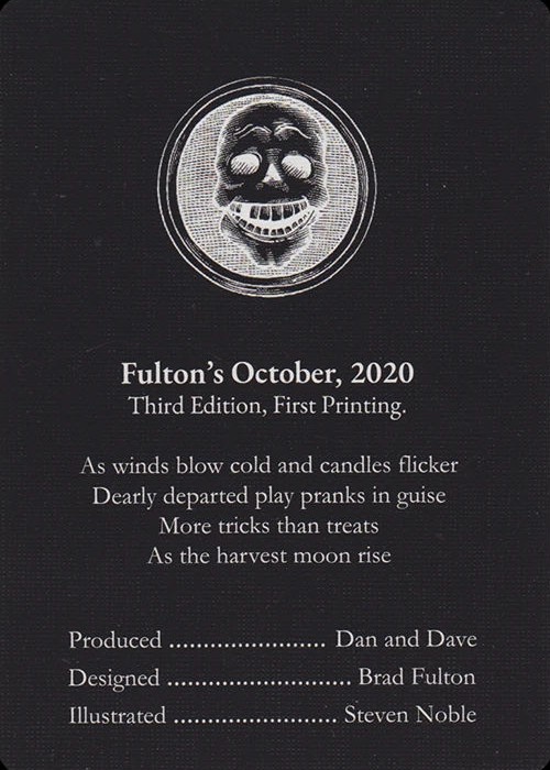 First released back in 2013 and then again in 2014. Fulton’s October playing cards return in an all-new way. Designed by Brad Fulton with original illustrations by Steven Noble.