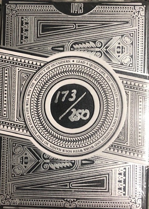 The Inspiration for this project has been an interesting one. So many of my decks in the past have centered around a theme or a specific moment in History. Because of this, I have always had historical characters to feature in my decks depending on the theme. For this project, the beginnings were a little bit different. Many times between projects I will spend a few days just gathering reference and pouring over tons of beautiful images of art and other things that I might find inspiration from. As I was searching for a creative direction for a new project, a song began to play on my playlist that really caught my attention. My wife sometimes calls me a nerd in my choice of music. I enjoy listening to all types of music but when I am working I seem to find the most focus listening to instrumental music from cinema, games, and other types of media. This song captivated me, and it was the catalyst for the entire project. I put it on repeat and listened to it to all day while creating a completely new set of court cards from the images of, what I would describe as a mixture of Sci-Fi and Fantasy. The designs that transpired over the course of the day were promising to me, and most of very different from any of my previous work. The title of the deck was actually derived from the title of the song that sparked it, Invocation. The Platinum Edition decks are printed by Cartamundi on the B9 Linen Finish with Silver Cold Foil on both the back and faces of the cards. The deck is packaged in a beautiful letterpressed tuck case by Clover St Press and features hot foil stamped with Silver and Black Foil. Embossed to enhance the look and feel of the tuck case. Black on white belly band KickStarter: https://www.kickstarter.com/projects/kingswildproject/the-invocation-exquisite-hand-illustrated-playing