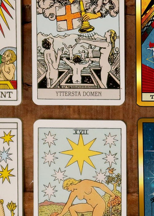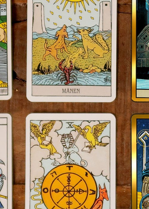The number cards are a fusion of french suits and latin suits: the latin suits appears as golden sigils on top of the french pips. The illustrations of the court cards (Jack, Queen, King) comes from the poker size variant Cartomancer (2018-2019) and additional 4 knights have been illustrated with the same style to complete the set of 78 cards.