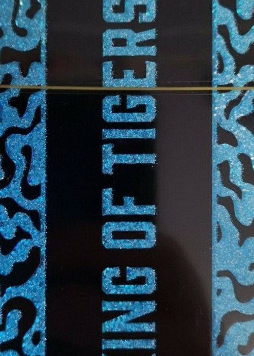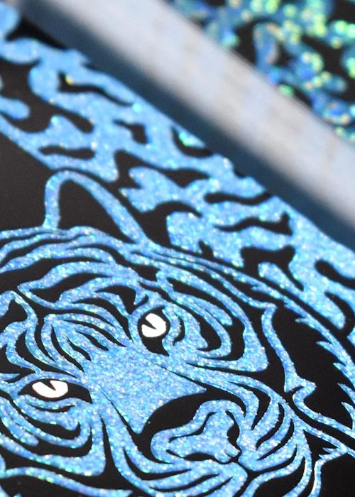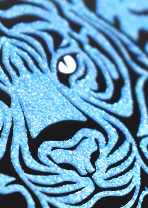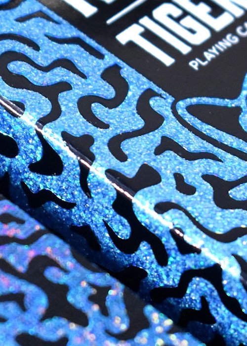 The KING of TIGERS Tuck Box features Black Foil, Blue Holographic Effects Foil and a Clear Spot UV that’s interspersed with Silver Glitter Flakes. Besides a gorgeous look, the Tuck Box has a unique physical texture to it. The bold Tiger face on the Tucks includes a subtle horseshoe mustache (a nod to the crazy source of inspiration).