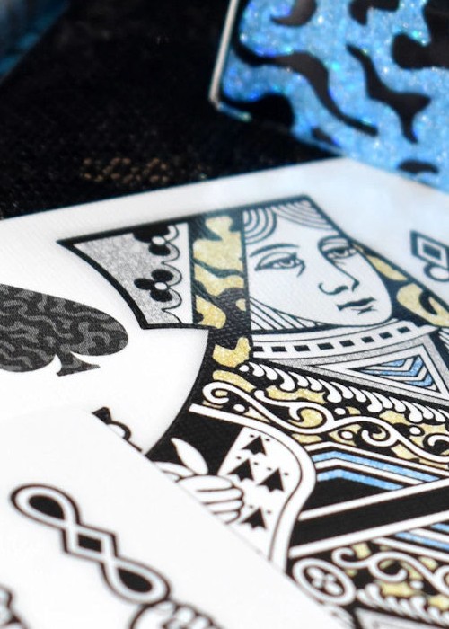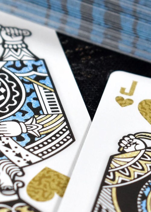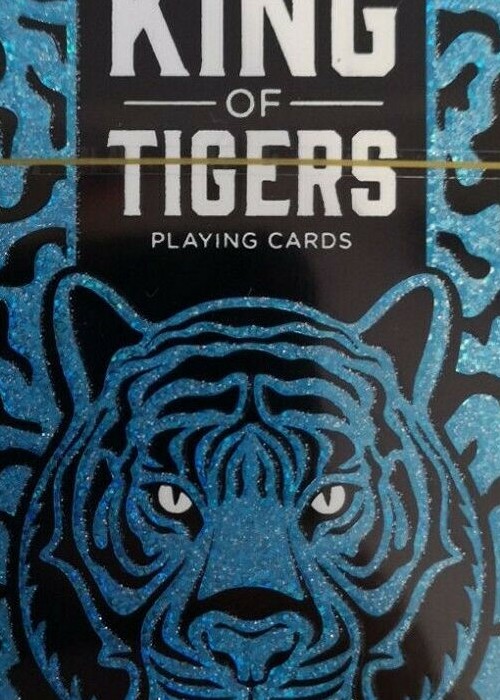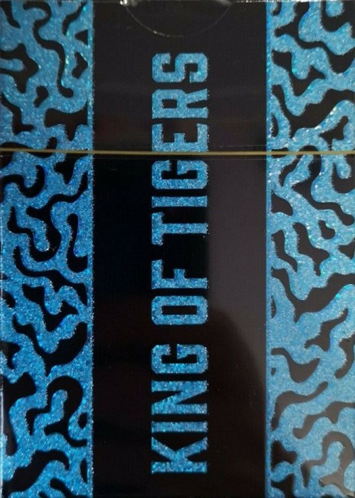 The Face Cards for The KING of TIGERS Deck are semi-custom – standard Courts with gold, blue and silver “glitter” outfits with the same pattern from the Backs. Gold PIPs for the Hearts and Diamonds and Black PIPs for the Spades and Clubs (also with subtle patterns within). The custom Jokers feature the horseshoe mustache Tiger (1 Gold version, 1 Blue version). The Face Cards are printed in 4CProcess.