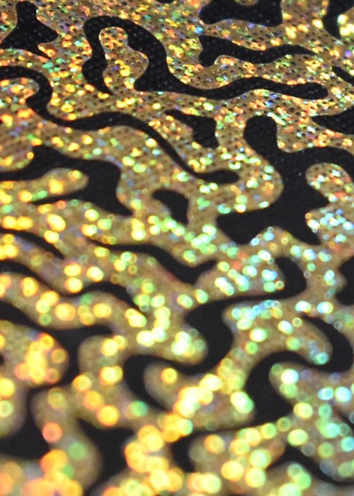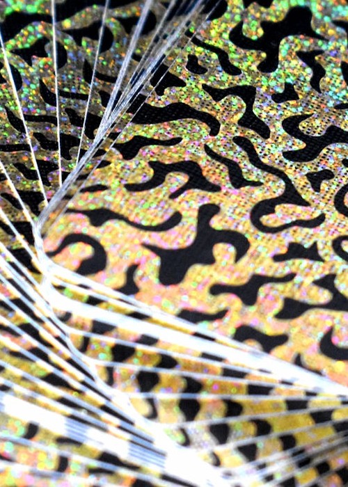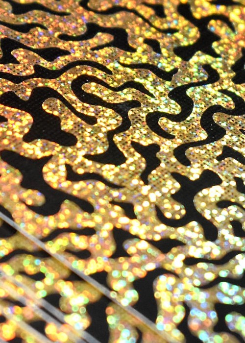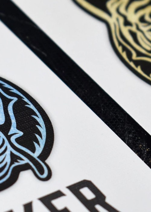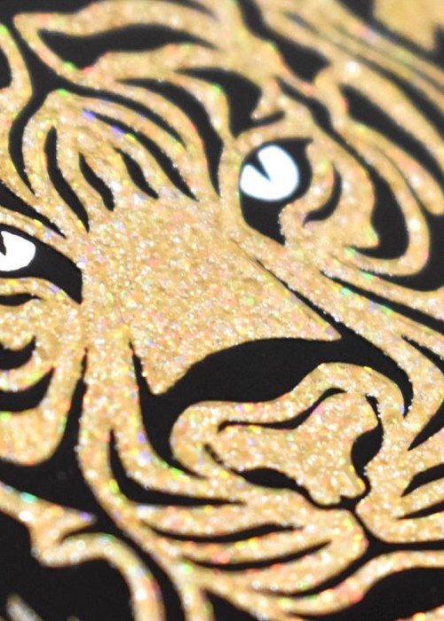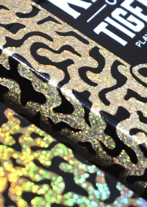 The KING of TIGERS Tuck Box features Black Foil, Gold Holographic Effects Foil and a Clear Spot UV that’s interspersed with Silver Glitter Flakes. Besides a gorgeous look, the Tuck Box has a unique physical texture to it. The bold Tiger face on the Tucks includes a subtle horseshoe mustache (a nod to the crazy source of inspiration).