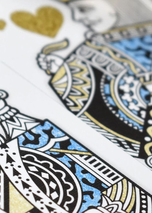 The Face Cards for The KING of TIGERS Deck are semi-custom – standard Courts with gold, blue and silver “glitter” outfits with the same pattern from the Backs. Gold PIPs for the Hearts and Diamonds and Black PIPs for the Spades and Clubs (also with subtle patterns within). The custom Jokers feature the horseshoe mustache Tiger (1 Gold version, 1 Blue version). The Face Cards are printed in 4CProcess.