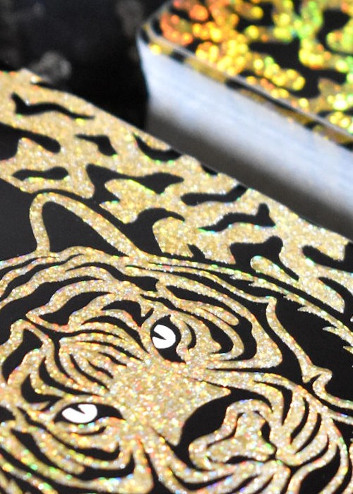 The look of the Tuck Box and Back Card is truly unique. Something I’ve never seen before!! Depending on lighting and angle of viewing, various shades of Gold, Reddish Orange and Green appear in spectacular luminescence. The KING of TIGERS Gold Deck is a perfect way to liven up any game night!