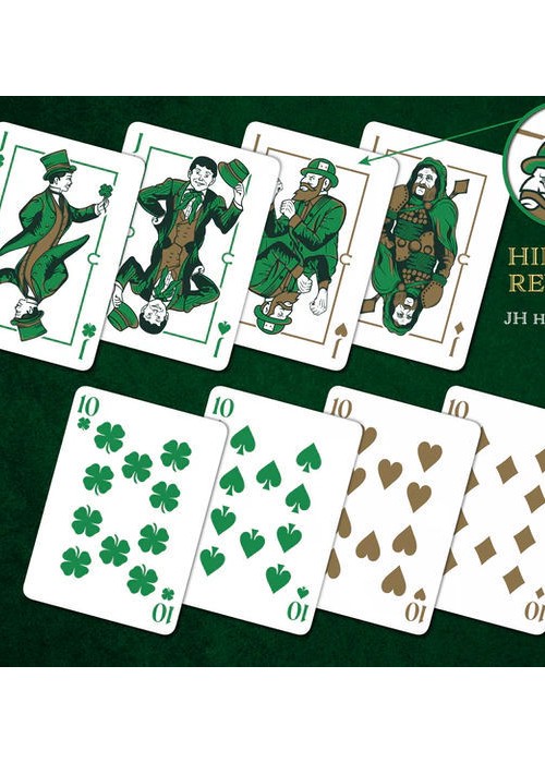 According to Irish legend, if you are lucky enough to capture a Leprechaun you can barter for his treasure. As a child I was fascinated by these little men that stand about as tall as a three-year-old, pinch you if you don’t wear green on St Patrick’s Day and hide gold at the end of rainbows. I have wanted to create a deck based upon this legend for quite a while. One day while talking to my friend and Artist Brad Gabbard or Native Tongue Studio, I ran the idea by him. Over the next several months he designed and redesigned many backs and court card combinations until he was finally able to come up with the perfect combination of both.