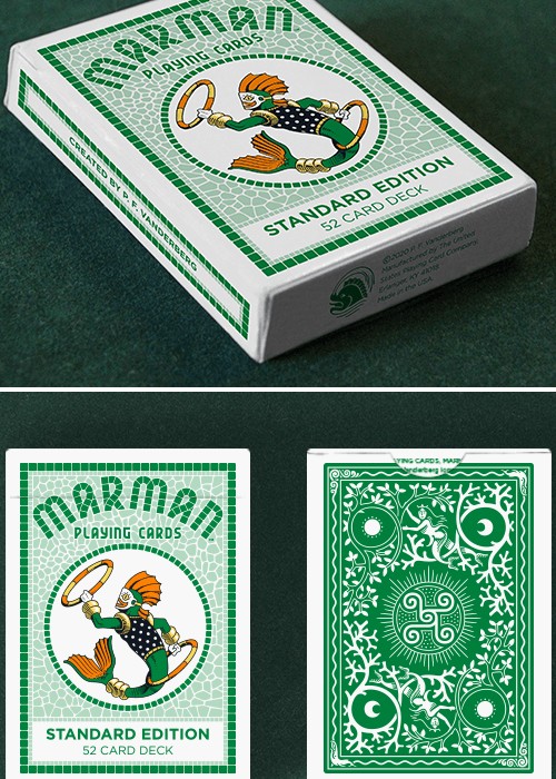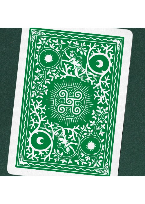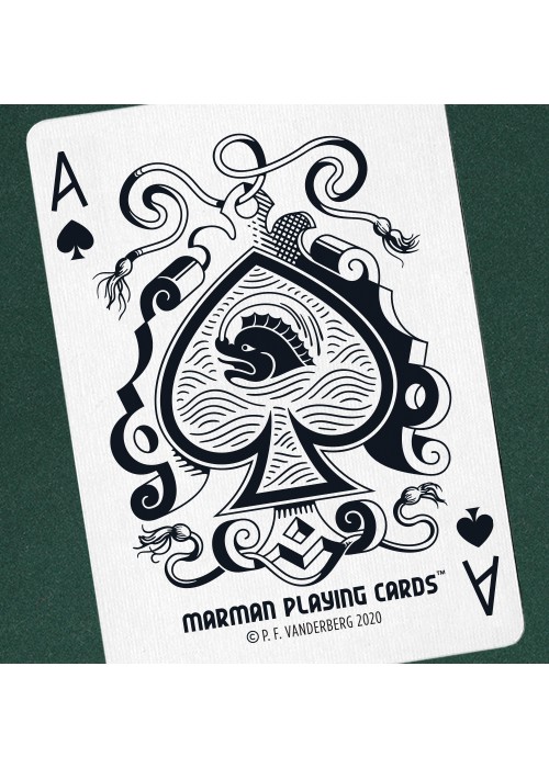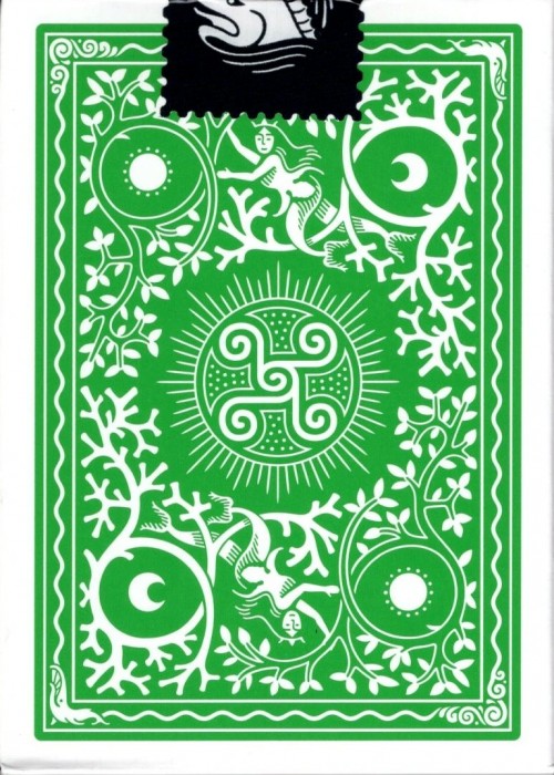 Marman Playing Cards™ is inspired by oceanic myth and superstitions that held their grip on sailors for centuries. Save for the number cards, nautical vibes flow throughout the deck with courts and jokers depicted as green fish people-the marmans. These fish people are the focal point of the deck’s theme, but the detailed symbolism on the backs and courts suggest the marmans are part of a larger story. kickstarter: https://www.kickstarter.com/projects/733229779/marman-playing-cards Full Deck Scan: https://cardscans.piwigo.com/index?/category/448-marman