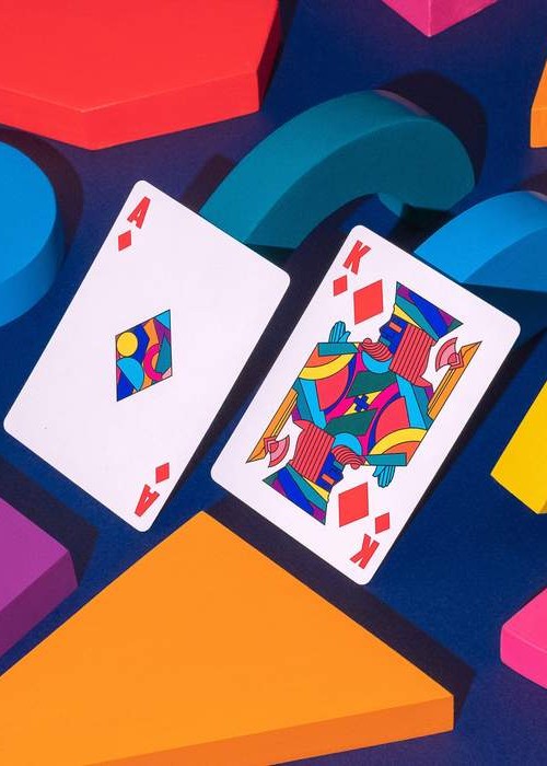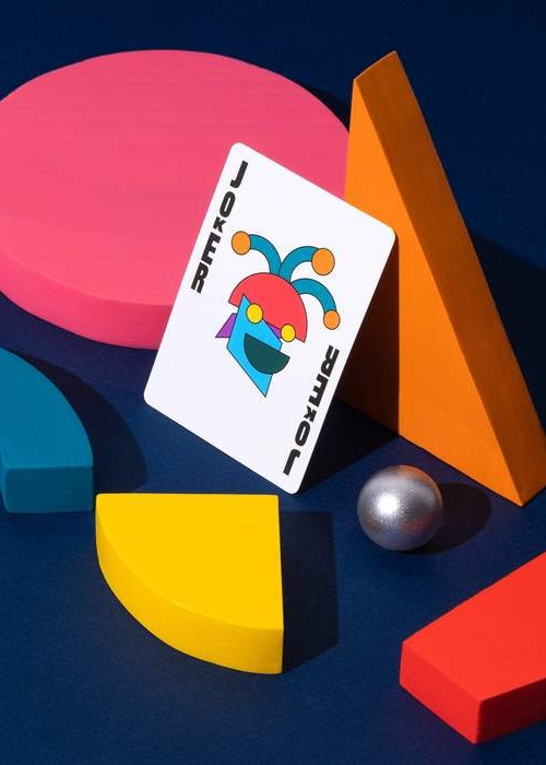 The deck’s fun colours don’t stop with the back design. The face cards are bright and angular, making the courts stand out. Perfect for cardistry!