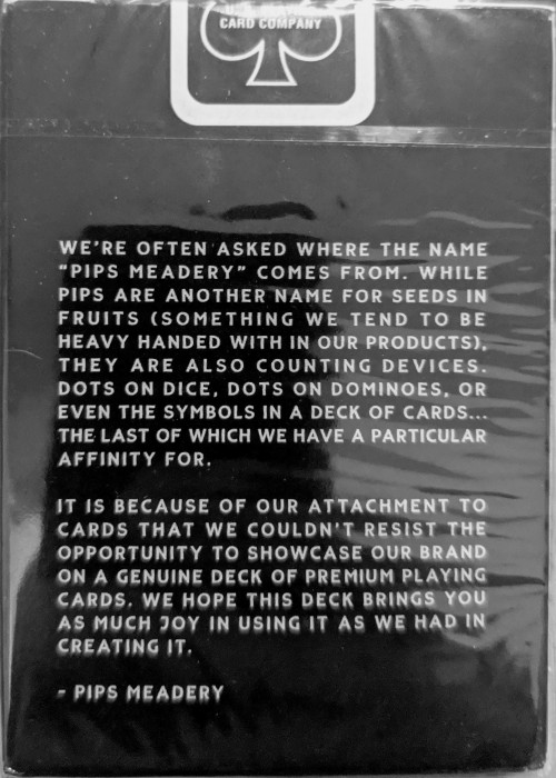Longtime Playing Card enthusiast with many in my collection. Started with getting uncuts from Ellusionist.com, and remember my first Black Ghost deck and the reactions they got. I own a small Meadery (honey-wine) operation in northern Illinois. We don’t sell our liquids online, but we do have a small merchandise shop on Shopify. Names of our products, the branding, themes and designs all focus on Magic or Parlor games…my father used to take me every Saturday to a magic shop to learn tricks when I was growing up and it was a huge part of my life when young and into college…and of course now it has become a major component of the business I’ve built. Well anyways — after much work with our designer, we ended up developing our first deck of cards. It was a bit of a project, but I hope we can do more down the road. I don’t know if anyone here would ever be interested in them since they are branded around a meadery, but I wanted to show them off. We designed them with the highest grade stock offered by the USPC, and we went with a linen finish so they cards slide nicely for those who use decks for illusions and sleight of hand. I’d say if I have one regret, it would be not going with a very cool custom box a la Kings Wild Project….but maybe we’ll do a LE down the road.