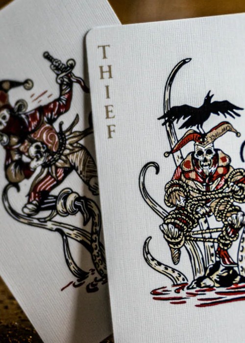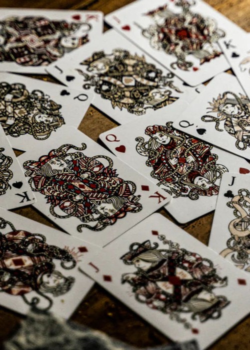 The court cards are all completely custom, with distinct characteristics. Each suit tells its own story, with each jack, queen and king symbolically linked.