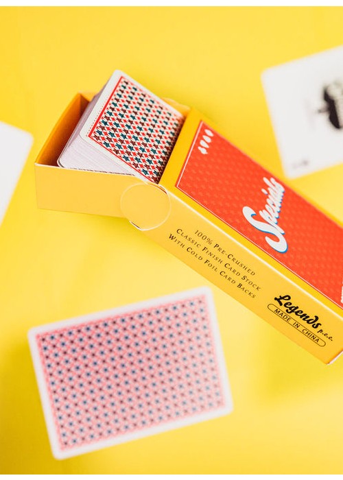Brand new packaging design never seen before in a deck of playing cards, with completely custom faces and Cold Foil card backs, this deck release sets a new standard. Each deck comes sheathed in a metallic sleeve with a custom seal. The tuck box is inspired by Cigarillo packaging and engineered by our team to perfectly fit a deck of playing cards instead of mini-cigars. Pull on the half-moon cutouts with your fingers and the tuck will slide out in a tray and hinge down, allowing you to effortlessly pull out the deck in a seamless action. This deck is one of our first to be printed on Pre-Crushed Classic Finish card stock. Crushing the paper fibers elongates them making the paper slightly more supple than Classic Finish. Coupled with cigar inspired fonts and quirky custom faces by Graeme Reed, the deck unboxing and handling experience will put a smile on your face.