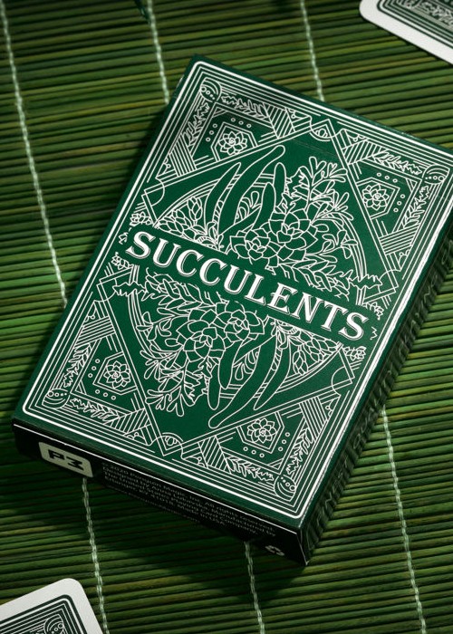 How to care for your Succulent Playing Cards. A handy guide for maximum enjoyment: -Give them enough light. Succulents do not like the dark, so take them out of the box often! -Shuffle regularly! Your Succulents do not like to be in the same spot all the time. -Never water! These Succulents are beautiful, but they do not require any watering. -Keep them clean. Always handle your Succulents with clean hands. -Avoid pests. Keep your Succulents in a protective clip or case to prevent damage from dogs, cats, small children, dust mites, and other infestations. Following these helpful tips will keep your Succulents in great shape. You’ll be able to enjoy the 100% custom artwork and the snappy handling for all of your favorite games, magic tricks, and cardistry exhibitions. Printed in the USA on traditionally-cut Classic stock with embossed Magic finish by the United States Playing Card Company, Succulent playing cards are printed using vegetable-based inks and starch-based laminates on FSC-certified paper sourced from sustainable forests Full Deck Scan: https://cardscans.piwigo.com/index?/category/735-succulents