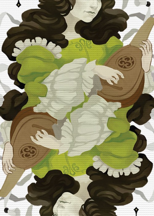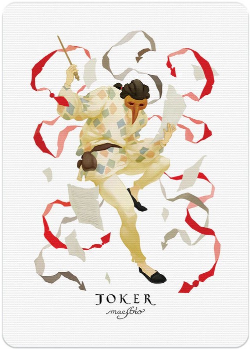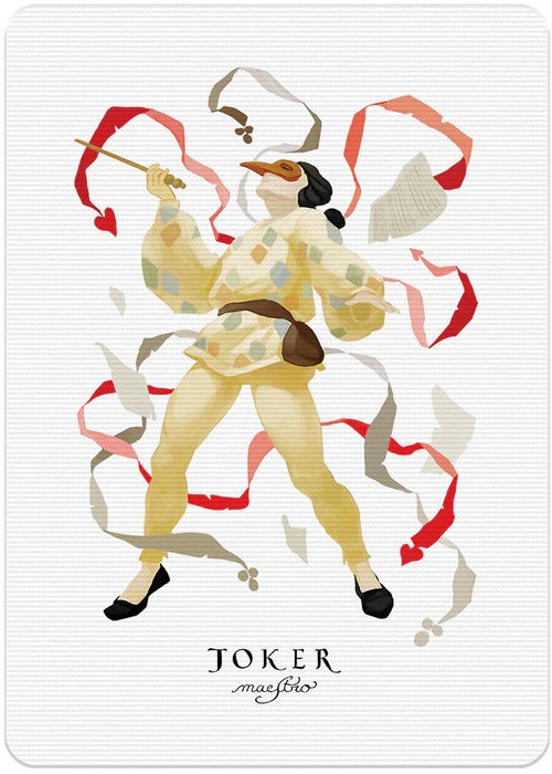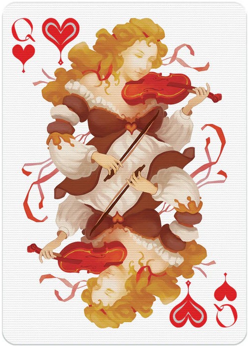 In Vivaldi Allegro characters are drawn with a (bowed) string instrument. All court cards are custom, and the colour scheme of each suit matches the mood of a season in order to homage The Four Seasons: one of the most famous masterpieces composed by Antonio Vivaldi.