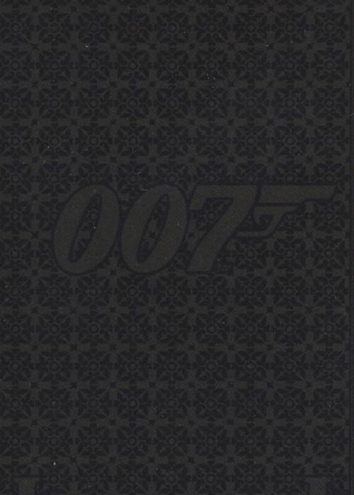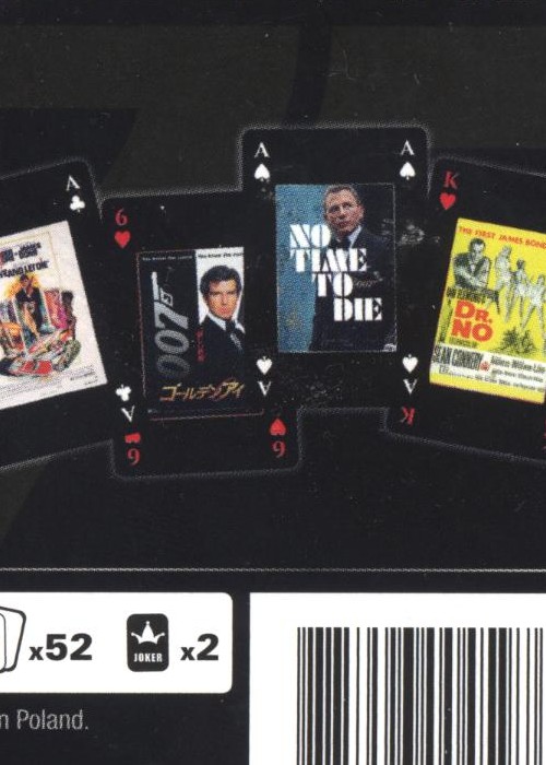 Waddingtons of London, a historic brand now owned by Winning Moves, produced this 007 licensed deck in 2020. With 54 unique images, the history of James Bond films is traced from Dr. No to No Time to Die through movie posters in several languages and from several countries. The ace of spades features the early No Time to Die promotional image listing the April 2020 release date, which was postponed to 2021. This is a bridge sized deck with a one-way back which is very dark in color, with the 007 gun logo in very low contrast.