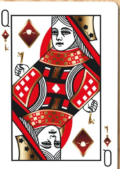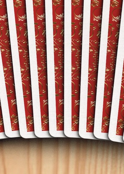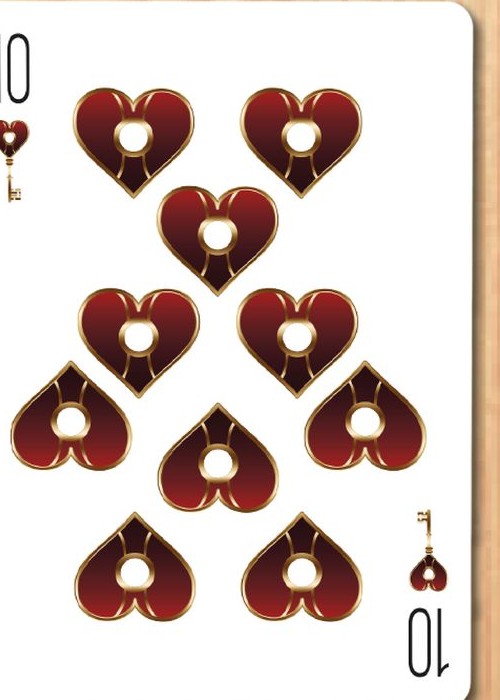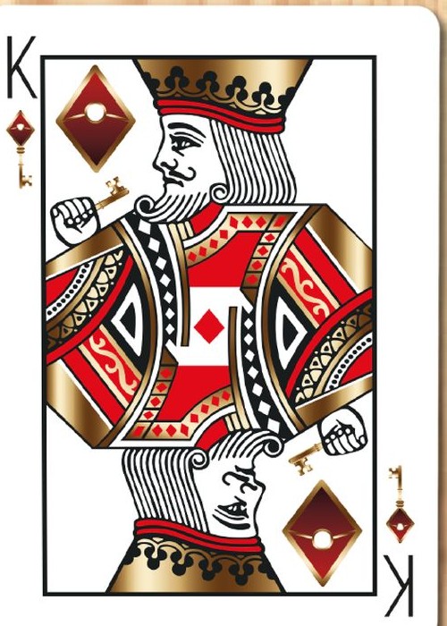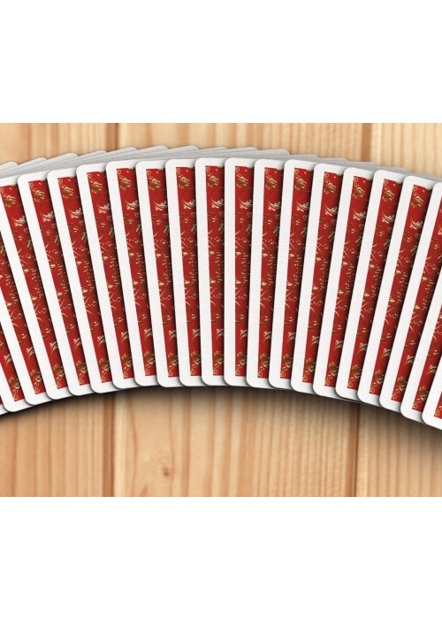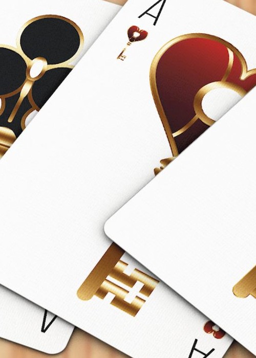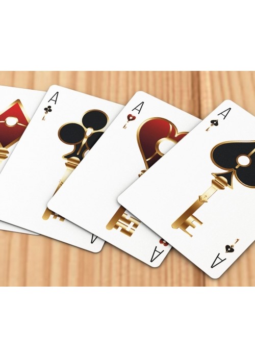 Welcome to the very first deck by Magic Almendros and Almenvi Playing Cards in collaboration with Max Playing Cards. A new design dressed in deep red with a touch of gold. Welcome to Bicycle Luxury Keys. Legend has it that the rulers of four great neighboring kingdoms collected their taxes and kept them in a locked chest. To avoid looting, a sorcerer cast a spell on its lock and only three people from each kingdom, the king (K), the queen (Q) and the knight (J), were able to open that chest with magic keys created by the best goldsmiths. Inspired by the legend of the magic chest, the Luxury Keys deck reinterprets the Bicycle classic with an elegant and luxurious aspect full of exclusive details. The Aces show the keys of the four kingdoms, forged in indestructible steel, but decorated by the most delicate hands to create high jewelry work with a golden and shiny finish. The court cards have a classic style and a traditional scheme, but completely renewed, showing the protagonists of our history with their keys in hand. The numbered cards have been completely customized. Each pip has been redesigned with a touch of elegance but keeping a perfectly recognizable aspect that guarantees playability and usability in card magic effects. The two Jokers in the deck are different and play around with the story to reveal the coveted chest content. However, the hidden treasure are not coins or jewels, but a fantastic card revelation that will delight card magicians. The back shows us the haunted keyhole in a highly ornate and subtly asymmetrical design, another powerful tool for magic. The tuck case is a blend of elegance and luxury with a mysterious atmosphere in a color combination where red and gold stand out. Having magicians in mind again, like in other places in this unique deck, the flap includes a card reveal.