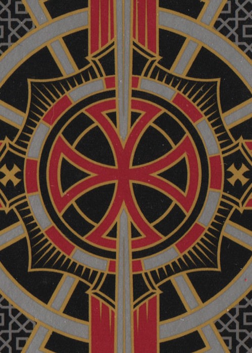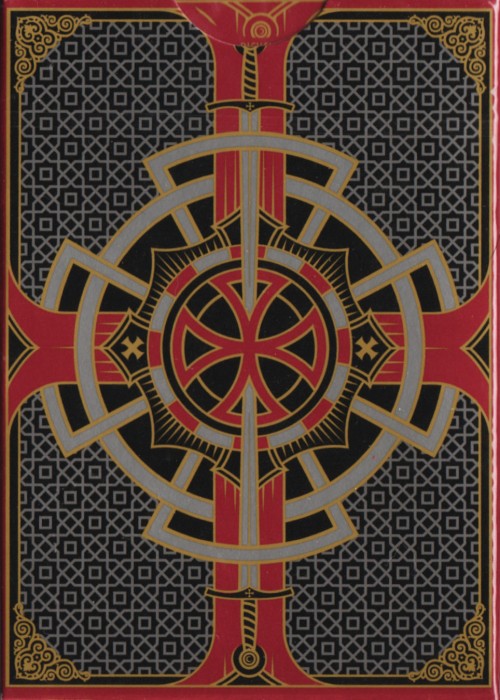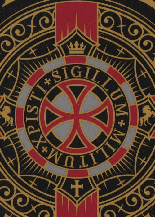 The backs in red/blue, black and gold/copper shows the cross and the sword, symbols from the Templar imagery, in an elaborate symmetrical composition. That symbology is also present in both jokers.