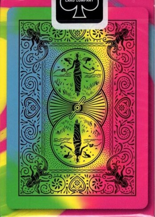 Cards Feature a Tie Dye Designed Back that can be used in any standard 52 card game and even includes 2 Gaff cards to do a magic card trick called Million Dollar Monte. The jokers are a Love & a Peace colored button pin, there is also a a piece sign on the center of the Ace of Spades and check out the pictures, look real close at the suicide King of Hearts which normally has him holding a knife thru his head, but this card has something different instead of the knife, check it out, very cool.