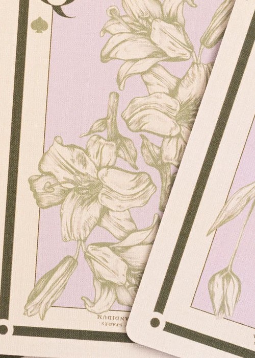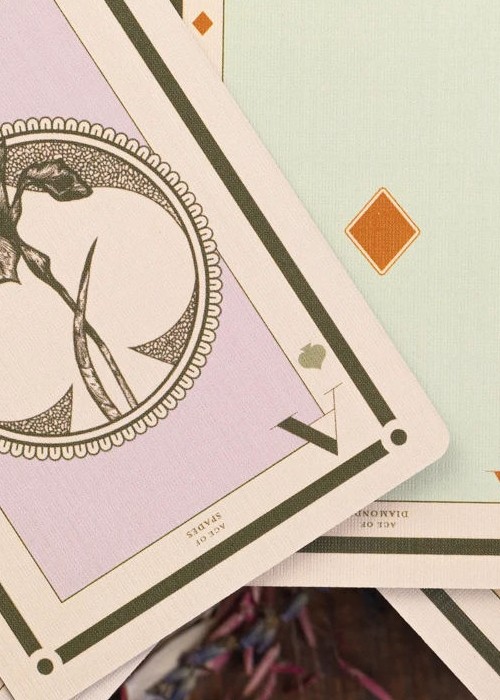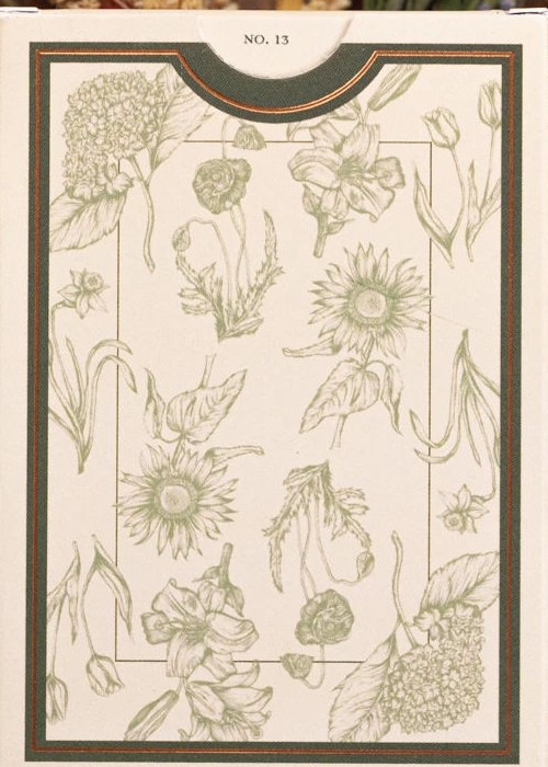 Designed by June Hyde, Botany takes inspiration from old scientific botanical illustrations. Each court card features a different plant species, all of which are included on the two jokers. The cards and tuck both feature a minimalistic design approach, utilizing a soft, muted color scheme that accents the scientific illustration motif.