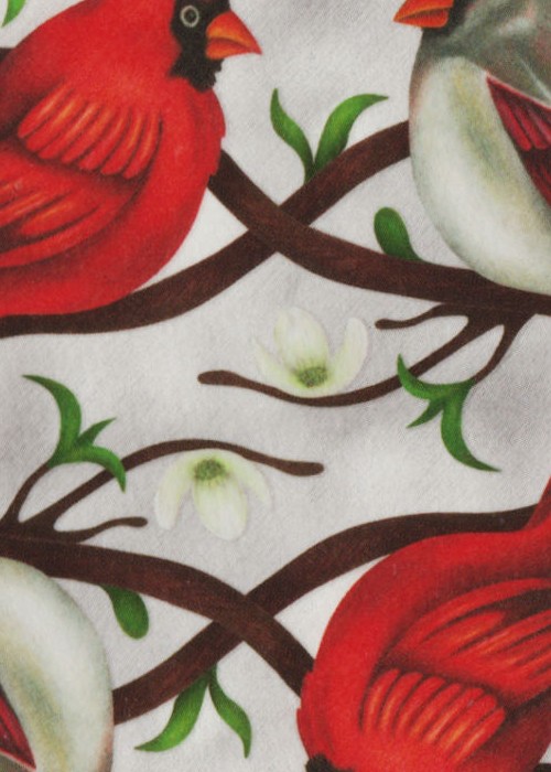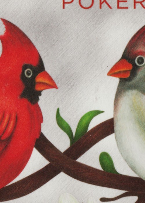 The Back Card for the POKER Deck features a symmetrical illustration of the male and female Cardinals set against the light grey winter-like background. The Face Cards are extremely playable, and the colored pencil backgrounds are subtly added to the PIPs and to the outfits of the standard Courts.