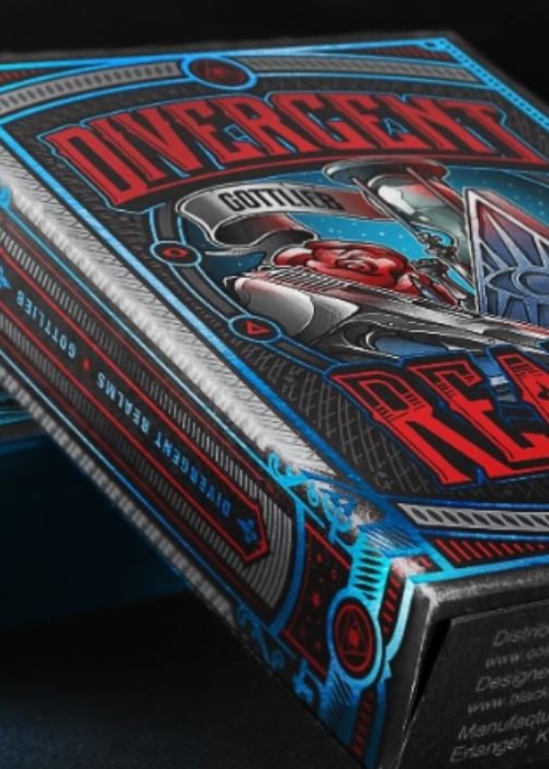 The first of the series, Divergent Realms Playing Cards’ Gottlieb Deck will feature hand-crafted detailed artwork, red Metallic inks and foil embossed tuck-boxes.