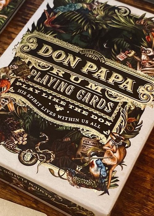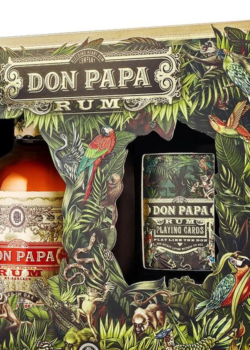 Don Papa Rum Playing Cards Gift Box contains a bottle and a pack of original playing cards. The design of the playing cards is inspired by the animals of the mystical Philippine Island of Sugarlandia, and the cards depict, for example, a tarsier king, a monkey queen or a frog joker. There is a QR code on the packaging of the card package, after which it will display video instructions on how to play one of the original Don Papa card game.