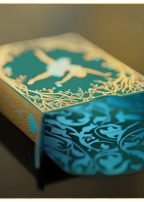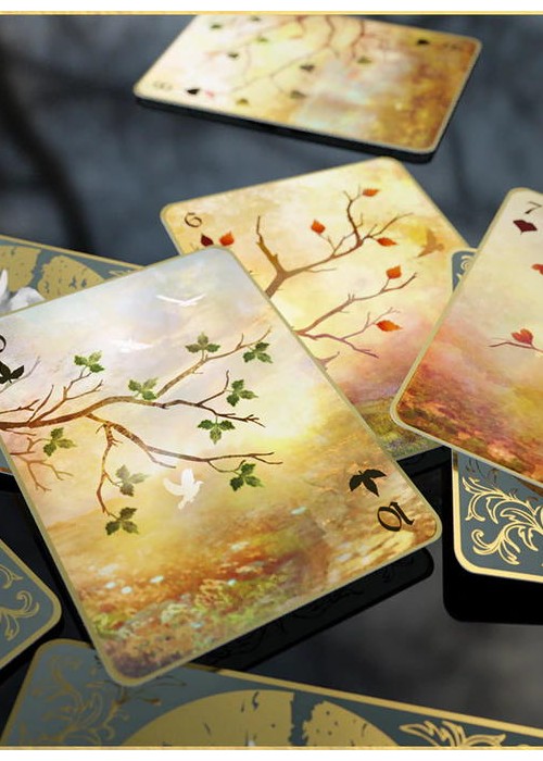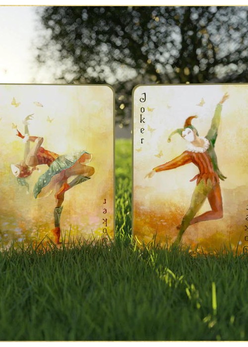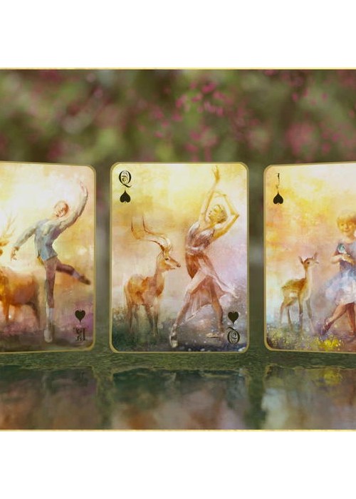 Each card has been meticulously hand-drawn by the artist, taking inspiration from ballet, and then entwining it with nature. The face cards have a warm palette, expressing the warmth of summer, and its rejuvenating heat. Each dancer is coupled with the grace of an animal or bird symbolizing the symbiosis between the soul and nature’s spirit.