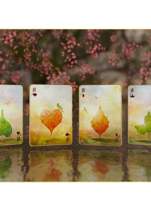 The tuck boxes will be a set, connected by a continuous design – The tree of life, with each season holding a part of the design and each season depicted by leaves shaped in the form of each custom pip of our card deck.