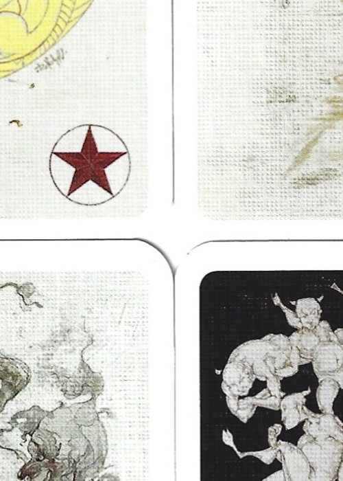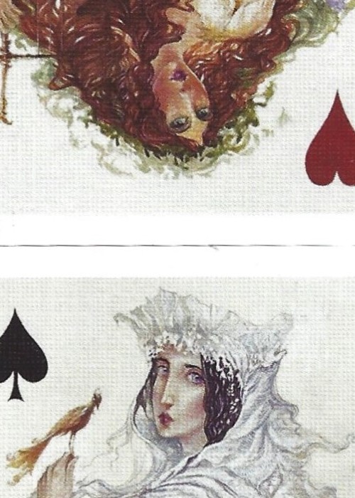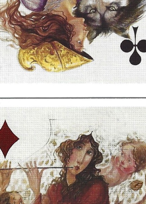 The Mythos deck of cards has traditional imagery design, featuring satyrs, forest dwellers, water creatures, demigods, ghosts, nymphs and fairies from various myths and parables, and introduces its own system of suit symbols (feather, bone, wheat, rose) based on the underlying mythological narrative.