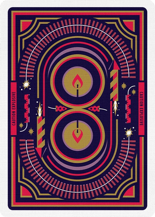 The Fireworks Playing Cards are Limited to 2500 Decks. Designed by Tyler Pate. Manufactured by the United States Playing Card Company with Metallic Inks & Bee Crushed Stock.