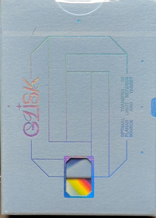 Optimal transfer of planar light between source and target Gaze into the paradoxical GLISK object and watch as light spirals into consciousness. A mythical symbol of impossible nature, recontextualized on paper to signify the circular relationship between observation, inspiration, and expression. Exchanging ideas. Transfer of planar light. Primary graphic elements extracted from fresnel lens and prisms. Matte tuck enclosure featuring multiple angular preview windows and pigment foil. For every 12 decks ordered, receive one complimentary deck of GLISK Iridescent Tuck Edition (1/200)