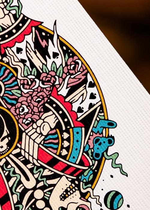 A Court of Colors JACKS, QUEENS AND KINGS The court cards are simply jaw-dropping. Continuing the use of iconic logos and mascots – bears, terrapins, and skeletons are prominently featured in vibrant detail. Every inch of the deck is fully custom, including the font style and design of each individual suit.
