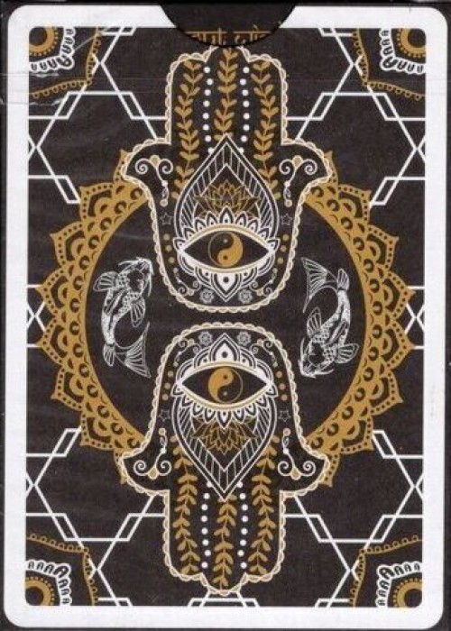 The Hamsa has a very clever but easy marking system which opens up amazing possibilities of performing hands on/hands off miracles for both hobbyists and seasoned performers. This elegant deck has been designed from the ground up and represents my own interpretation on everyday life, dealing with challenges and adversity. Prajña meaning – Wisdom, Intelligence or Understanding. The Hamsa Hand – in all faiths the Hamsa is a protective sign. It brings the owner happiness, luck and good fortune. Yin Yang Symbol signifies balance and harmony in life and learning to embrace its dualities. Lotus Flower signifies purity, enlightenment, self regeneration and rebirth. Koi Fish – one koi swimming downstream to signify creating inner power, to overcome challenges. The Koi swimming upstream represents overcoming obstacles and gain strength to move forward. Marked for suit.