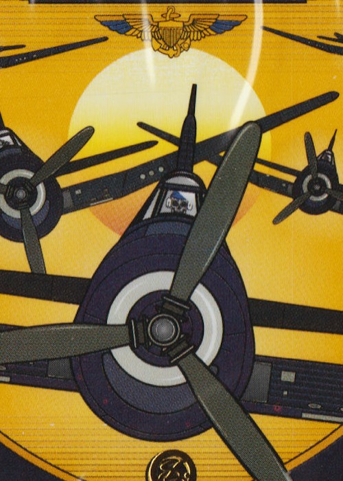 The Blue Angels is the United States Navy’s flight demonstration squadron. The team was initially formed in 1946 by order of the Chief of Naval Operations Admiral Chester Nimitz. It is the second oldest formal aerobatic team in the world. The first Blue Angels demonstration aircraft was the Grumman F6F-5 Hellcat. They were navy blue (nearly black) with gold lettering. The current shades of blue and yellow were adopted when the first demonstration aircraft were transitioned to the F8F-1 Bearcat. This deck depicts the planes in the nearly black navy blue color.
