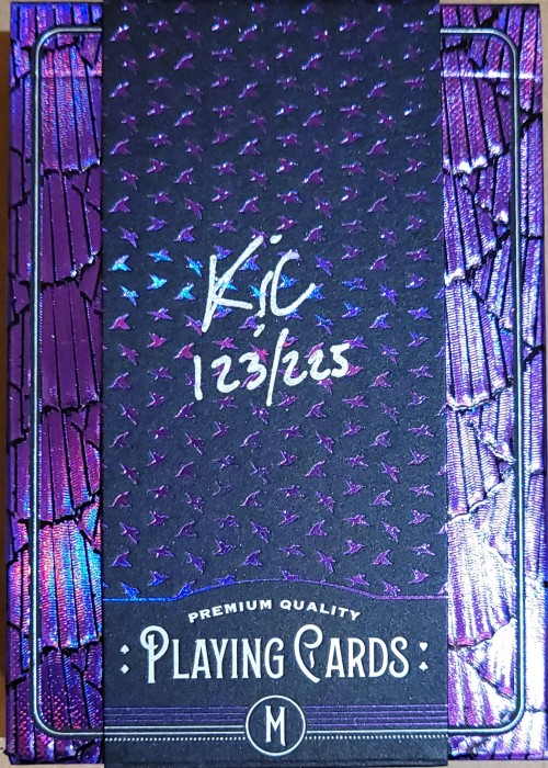 The tuck case features sculpted embossing, multiple holographic foils with a specialty print process, while the 52 cards plus extras feature a full flood of the holographic foil feathers on the back. The card faces are classic in style, but refined and customized for the theme and feature highlights of holographic foil as well. Deck contains 52 cards, 2 Jokers, 1 Double Back, and 1 Ad Card. Cards: Printed by Cartamundi: Slimline B9 with holographic foil on both sides. Tuck: Printed by Fresh Impression: Multiple holographic foils, sculpted embossing.