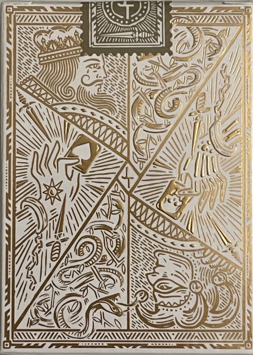 The new and improved version of White Gold Edition. Featuring sublime heavy embossing on all surfaces of the tuck box and other refinements. This edition has been reprinted by the famous United States Playing Card Company in Kentucky, featuring their to-die-for crush stock and finish and premium Metallic inks. Due to minimal ink saturation on the card stock, this deck is amongst our best in terms of handling and durability. Compared to v2, You can see the difference in the bottom of the tuck. It says JOKERANDTHETHIEF.COM