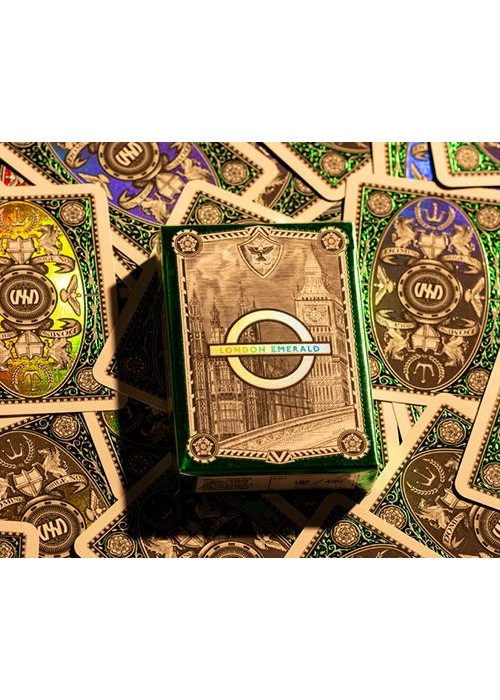 The Emerald Deck showcases a layer of individual custom transparent holographics on every card front, plus transparent holographic foil on the card backs. An additional rich green metal foil layer on the card backs gives this deck a regal look, befitting of the general theme. These decks are numbered and limited to 499 and will never be reproduced!