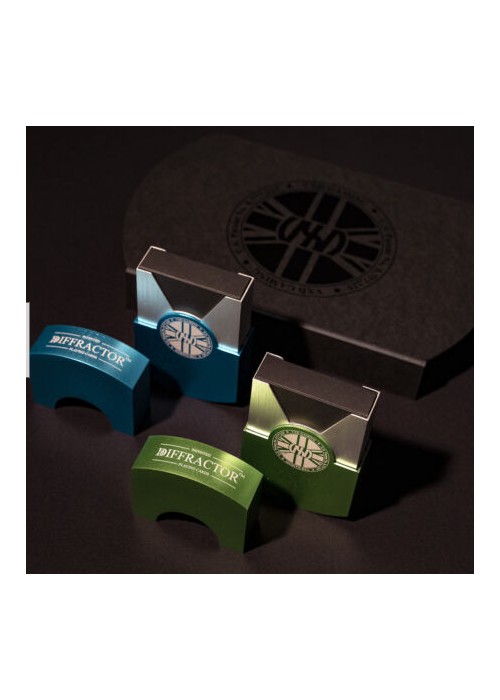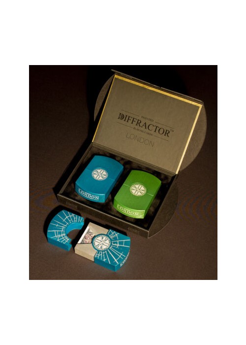 2 DECK BOX SET BOX IS BLACK AND SAME SHAPE AS METAL CASES EMERALD METAL CASE AND EMERALD DECK ICE BLUE METAL CASE AND ICE BLUE DECK VXD Gaming brings you the London Diffractor. Designed by VXD Gaming and Lance T Miller and produced by Vrijdag Premium Printing, the London Diffractor decks use the patented printing technology developed by VXD Gaming (US. Patent. No. 8,777,225), which combines a standard layer of ink printing, as found on normal playing cards, with an additional hot-stamped layer of transparent holographics, of the type typically only found on passports and other ID documents. This combination produces an entirely unique look within the playing cards industry and presents new possibilities for design expression and sets a new bar for luxuriousness. The result is a mesmerizing combination of holographics and ink, lighting up at different angles and in different lighting conditions and producing a combined artwork which tells a story of the heritage of London. Our tip: For best effect, we recommend viewing under a single bright light source such as a halogen spotlight, with ambient lighting around (such as daylight) cut to a minimum. Casino table lighting conditions are ideal, for instance.