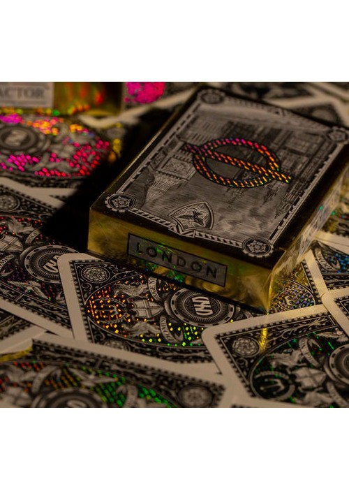 Presenting the second in the Diffractor City Series, VXD Gaming brings you the London Diffractor. Designed by VXD Gaming and Lance T Miller and produced by Vrijdag Premium Printing, the London Diffractor decks use the patented printing technology developed by VXD Gaming (US. Patent. No. 8,777,225), which combines a standard layer of ink printing, as found on normal playing cards, with an additional hot-stamped layer of transparent holographics, of the type typically only found on passports and other ID documents. This combination produces an entirely unique look within the playing cards industry and presents new possibilities for design expression and sets a new bar for luxuriousness. The result is a mesmerizing combination of holographics and ink, lighting up at different angles and in different lighting conditions and producing a combined artwork which tells a story of the heritage of London.