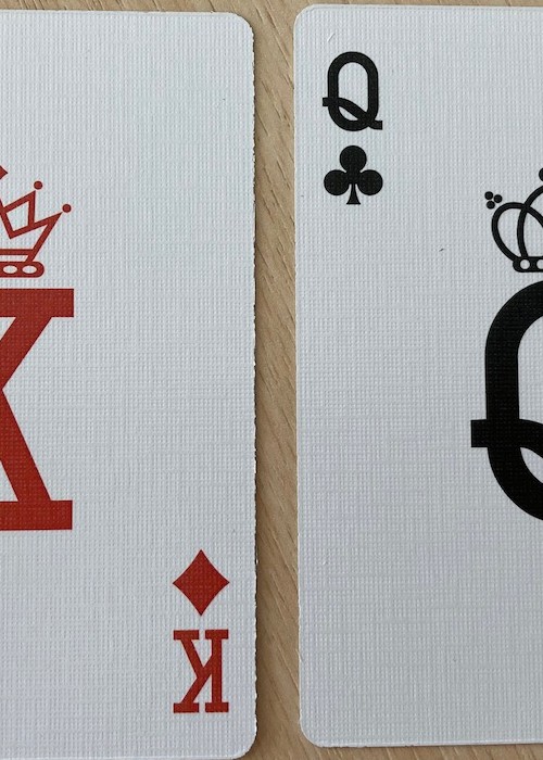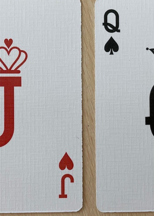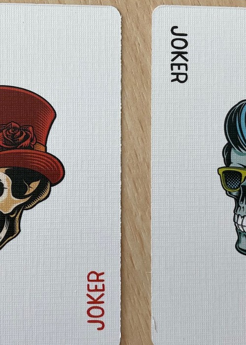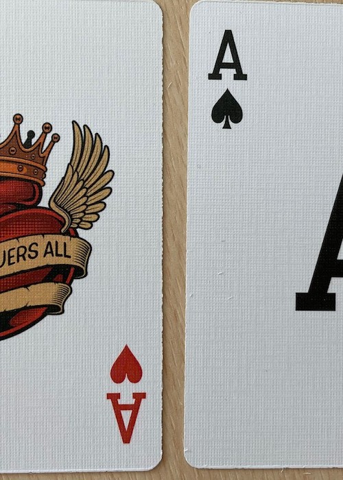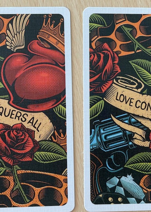 This ‘Love Conquers All’ playing card deck has a totally unique pip scheme and includes court cards featuring typography with crown icons. A detailed tattoo illustration covers the backs and a winged heart is used for the ace of hearts and box. Each joker has its own skull which beautifully complete the 54 card deck. Available from https://www.etsy.com/uk/listing/975312909/tattoo-poker-playing-cards-unusual