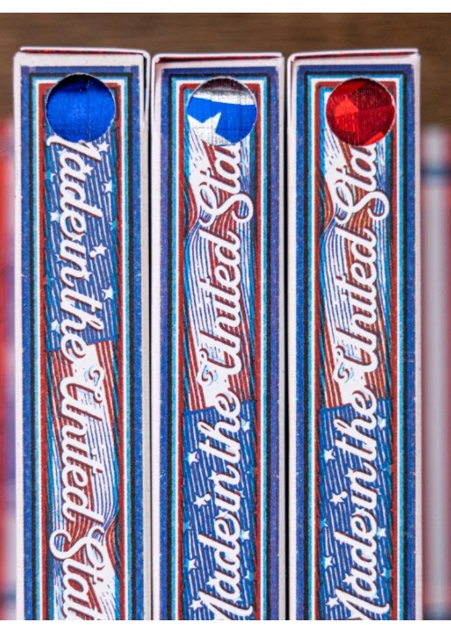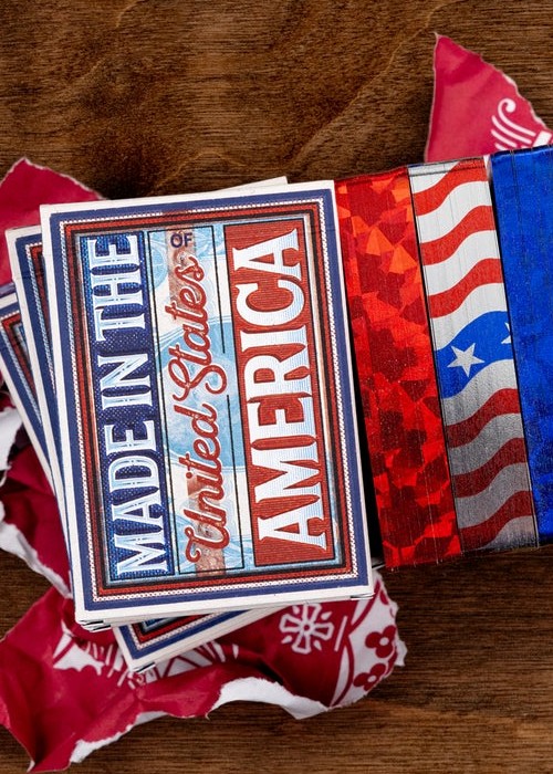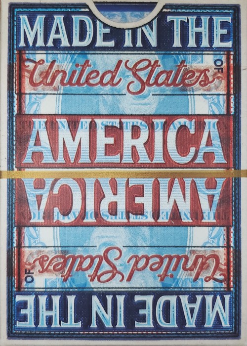 Nothing says ‘Merica like a little sparkle! We have three gilded Made in the United States of America decks to bring your way. Featuring a Blue, Red and for the first time ever, an American Flag Gilding. These Gildings are some of the finest we’ve ever produced.-From the Kings Wild Project website. This is the American Flag Gilded version. Decks are not numbered and feature a unique flag gilding that can be viewed from either side of the tuck through a small round cutout. Three Gilded decks were made available including a Red Gilded deck, Blue Gilded deck, and an American Flag Gilded deck. There were only 70 Red Gilded decks, 70 Blue Gilded decks, and 55 American Flag Gilded decks made available. They were sold on the Kings Wild Project website starting on the 7th day of the 2021 12 Days of Christmas event on the 7th of December, 2021. Kings Wild Project Website: https://kingswildproject.com/ Listing for this deck: https://kingswildproject.com/products/made-in-the-usa-gld?variant=41322249715911