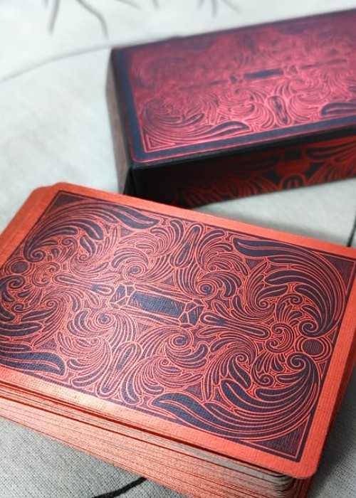 This deck is produced by Azoth Playing Cards a luxury card brand in China. This deck was released in China. 900 of them were printed to be sold in China and less than 100 of them made it outside China and less than 12 of them made it to USA .So much foiling is used in this deck that the blank card looks like a metal card but the deck handles smoothly. A true gem to display in your collection